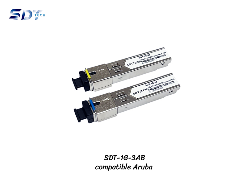 1.25G SFP SM SC BIDI DDM 3KM Compatible Aruba แบรนด์ SDT-TECH รุ่น SDT-1G-3AB เป็นโมดูลแสงไฟเบอร์ออฟติกที่ใช้เสียบกับอุปกรณ์ที่มีพอร์ท (SLOT) เสียบโมดูลประเภทนี้ เช่น Gigabit Switch Aruba, HP ความเร็ว 10/100/1000Mbps เพื่อที่จะลิ้งอุปกรณ์ 2 ตัวเข้าด้วยกันในระยะไกล เหมาะสำหรับใช้ร่วมสายไฟเบอร์ออฟติกชนิด Single-mode สำหรับรุ่นนี้สามารถทำงานได้ในระยที่ต้องไม่เกิน 3 กิโลเมตร โดยใช้หัวเชื่อมต่อโมดูลแบบ SC ได้ทั้งแบบ UPC และ APC